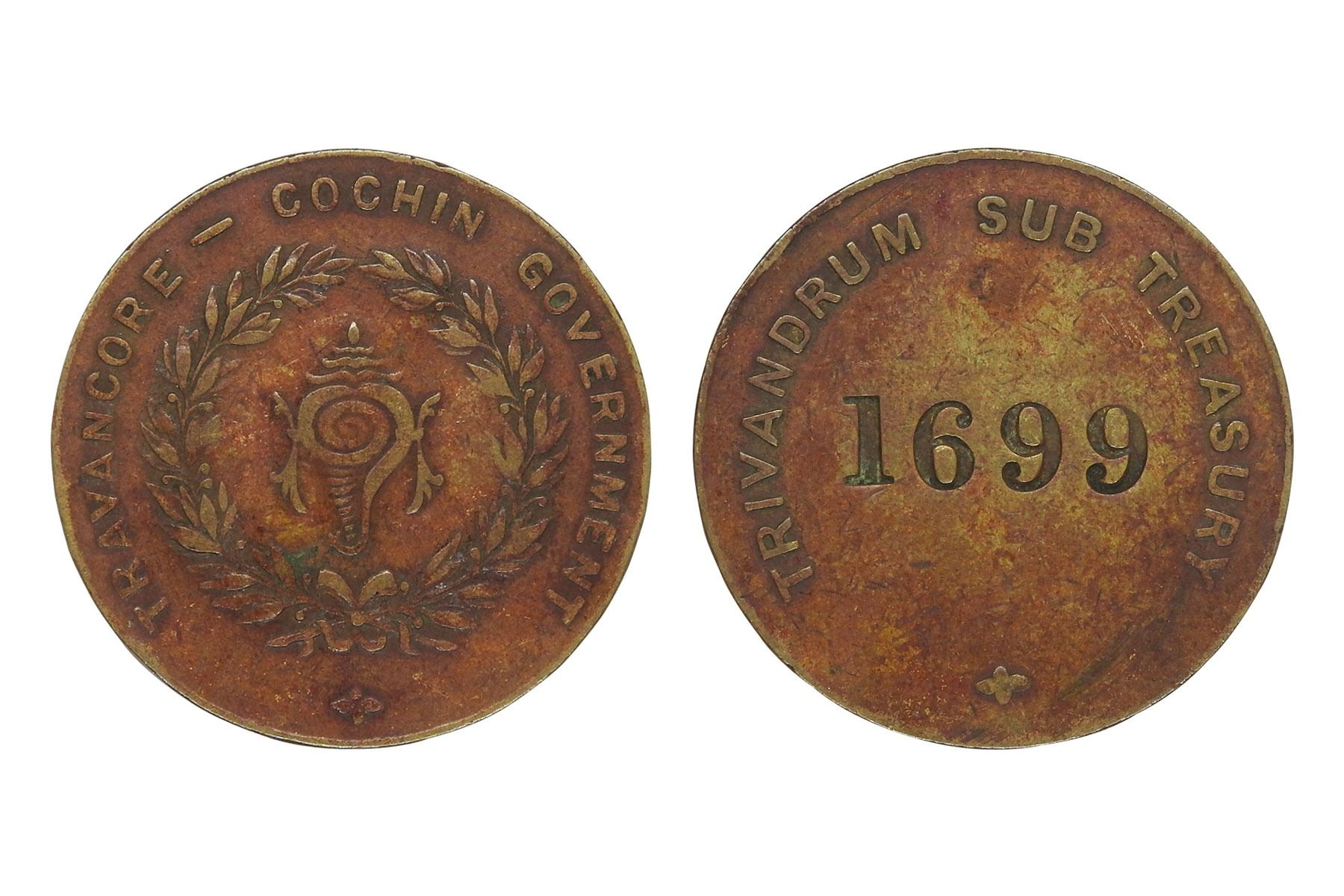 Travancore Cochin State, Brass pass/teller token of the state treasury, sub-treasury office at Trivandrum (Thiruvananthapuram), state emblem of Sankha shell on the obverse and etched number 1699 on reverse, c. 1950-1955, 14.50 grams. The state of Travancore-Cochin was formed by the merger of the two princely states of the same names in 1950 and remained in existence till 1956. The state had four districts and 36 taluks. The Treasury Department ran the finances of the state. Sub-treasuries were located at the headquarters of every taluk. Very Fine, Rare.