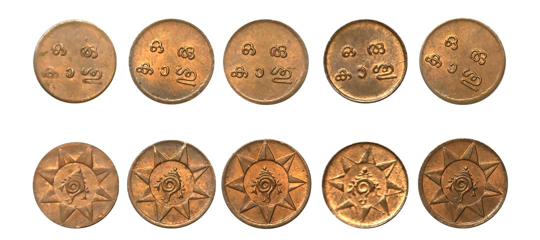 Travancore, Rama Varma VI (1928-1949), Copper Cash, 2.61 gms (average weight), Set of 5, Obv. Conch within 8-pointed star, Rev. inscription, KM #46, uncirculated, very scarce.