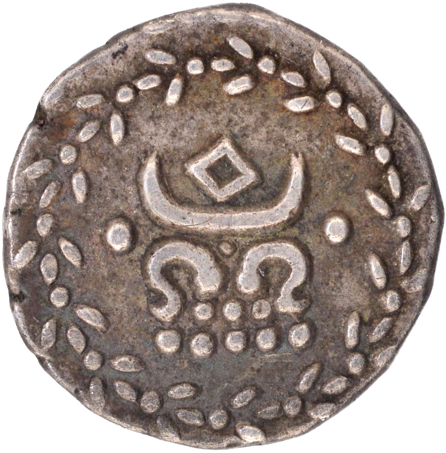 Travancore State, Rama Varma IV (ME 1035-1055/1860-1880 AD), Silver Velli Fanam or Panam, Obv: Chuckram within a large crescent above Vishnu Padam that is represented by two curved lines 10 pellets,Rev:One thousand thirty-six year in Tamil PA KA (Panam one) in Tamil letters around the device,1.46g, 12.11mm, (KM # 22/B.Sarasan # 212), AU details, Rare.