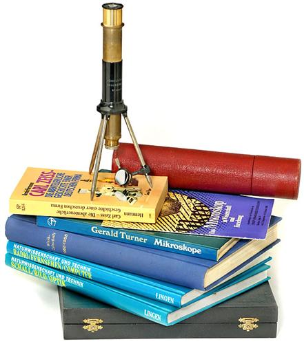 Reise-Mikroskop "Voigtländer", 1924, und Fachliteratur Signatur: "Voigtländer, Braunschweig", Nr. 52609, klappbarer Dreifuß, Höhe: 22 cm (zusammengeschoben), mit Voigtländer Objektiv Nr. 2, inklusive Köcher. - Und: "Mikroskope", Gerald Turner, 1981; "Schall, Bild, Optik", Lingen, 1981; "Radio, Fernsehen, Computer", Lingen, 1991; "Carl Zeiss", Armin Herman, 1992; "Zeiss Informationen", Bände 44-56, gebunden.