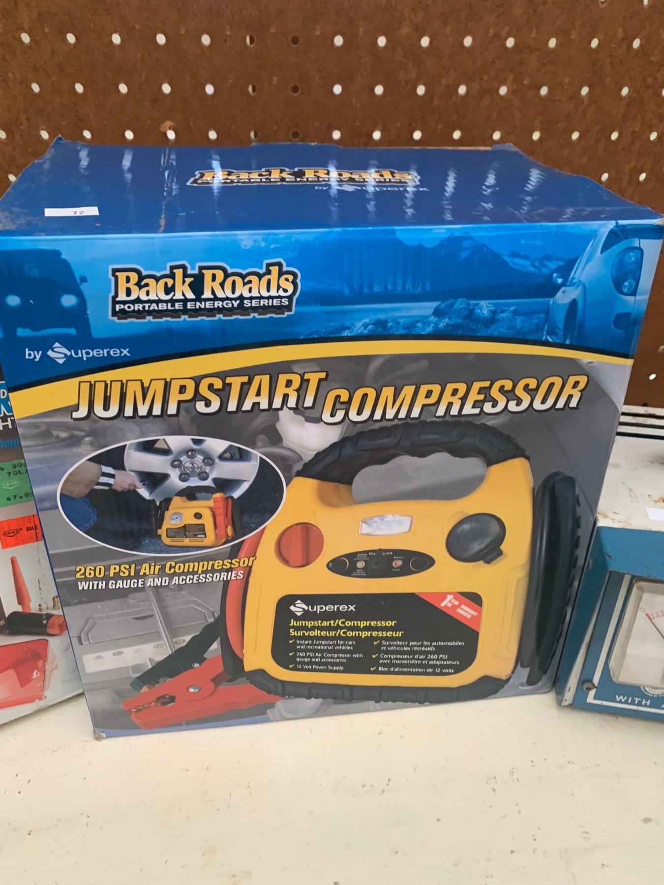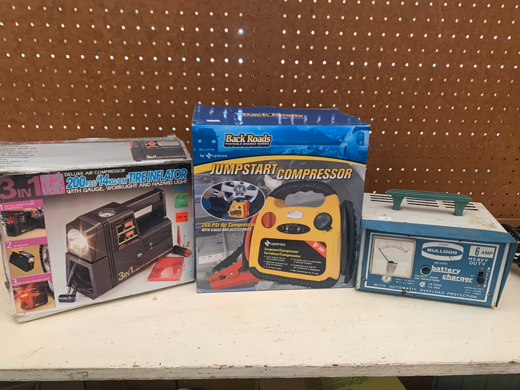 Travel Tool Kit! Backroads Jumpstart Compressor Combo, Eatons Battery Charger, Tire Inflator