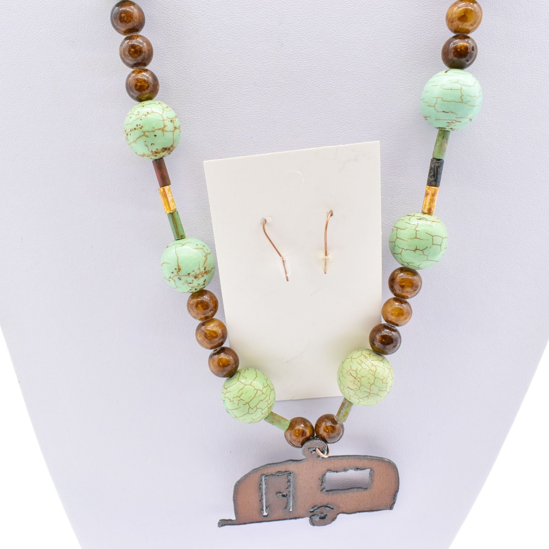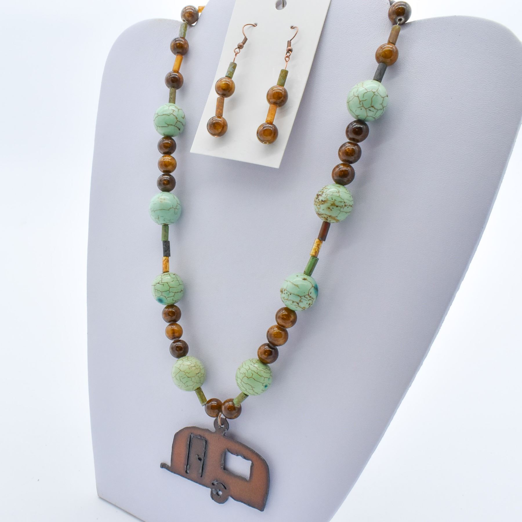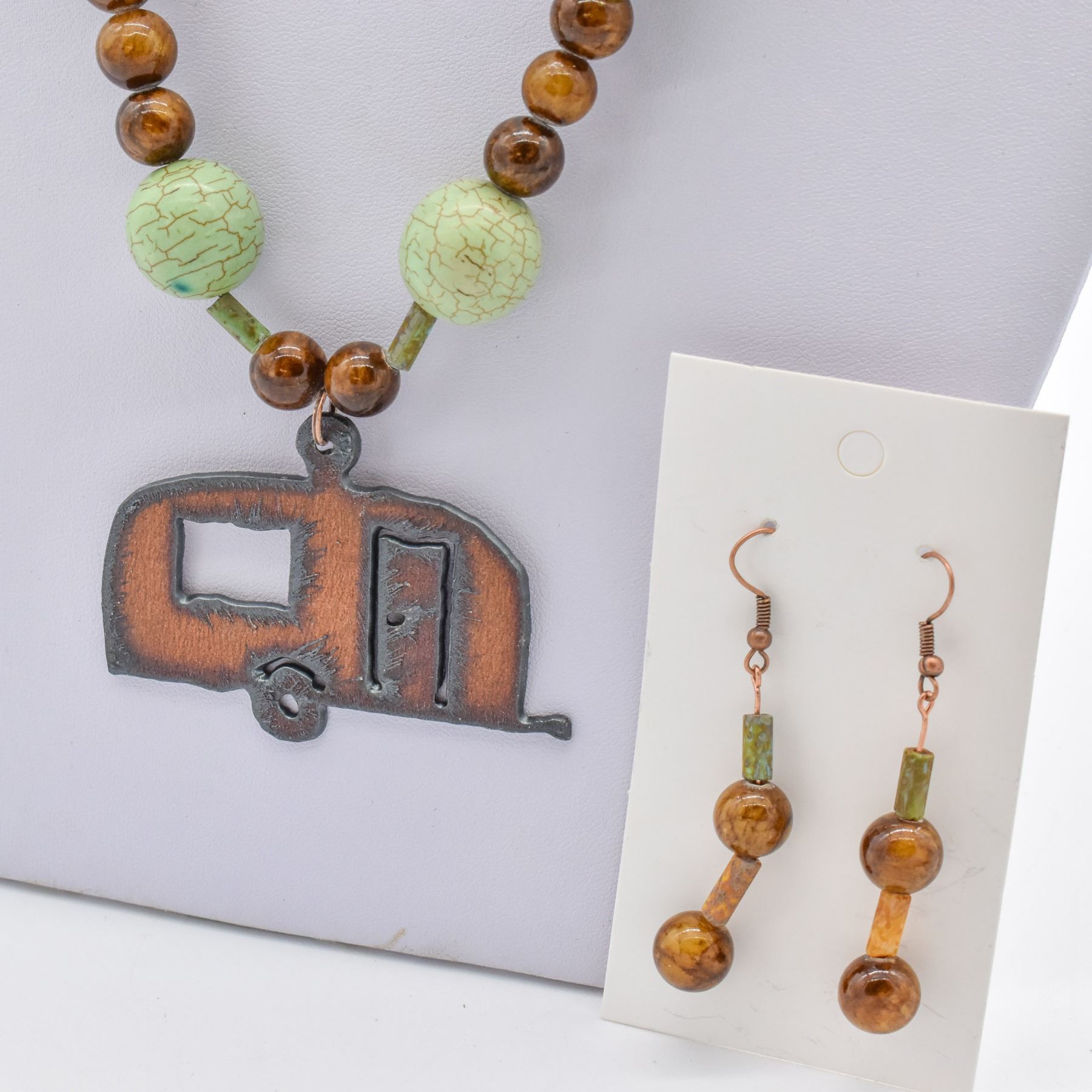 Quail Ridge Studios Travel Trailer Pendant Necklace and Earrings by Larry McLellan, (...''trailer for sale or rent...rooms to let 50 cents''...), necklace is comprised of large 12mm pale green magnesite beads with brown matrix, secondary beads are chocolate brown jasper 10mm beads with Picasso Czech matte tube beads as accent colors, the plasma-cut focal travel trailer pendant measures 2.25'' x 1.75'', matching earrings have a drop of 2'' on copper French wires, The magic of the Desert Southwest is timeless in its display of open landscapes, sunrise and sunset colors with infinite possibilities of artistic expression. The design studio of Quail Ridge was founded on these possibilities, forging an endless variety of earthen gems to their metallic counterparts. The artist, Larry McLellan, designs jewelry contemporary in style, while maintaining elements of native designs.