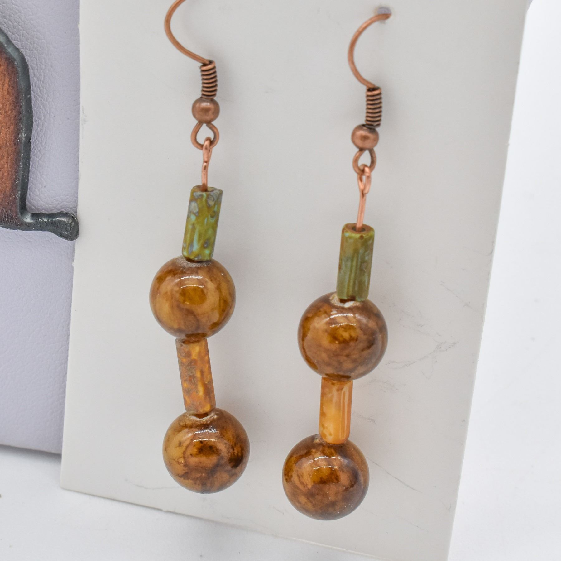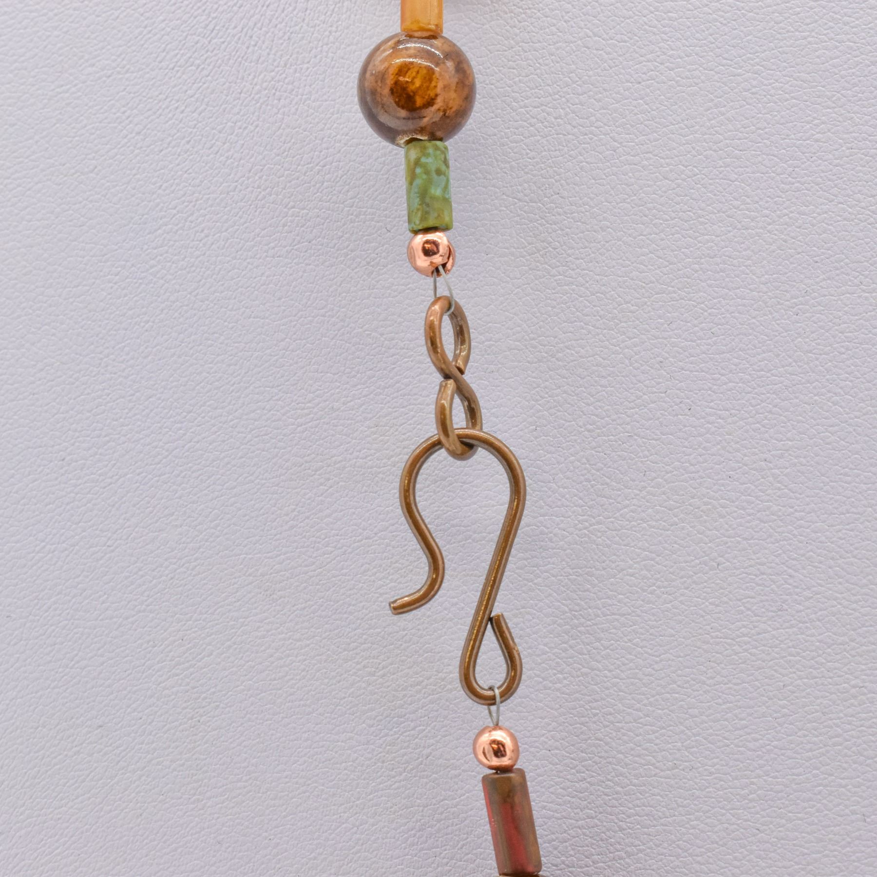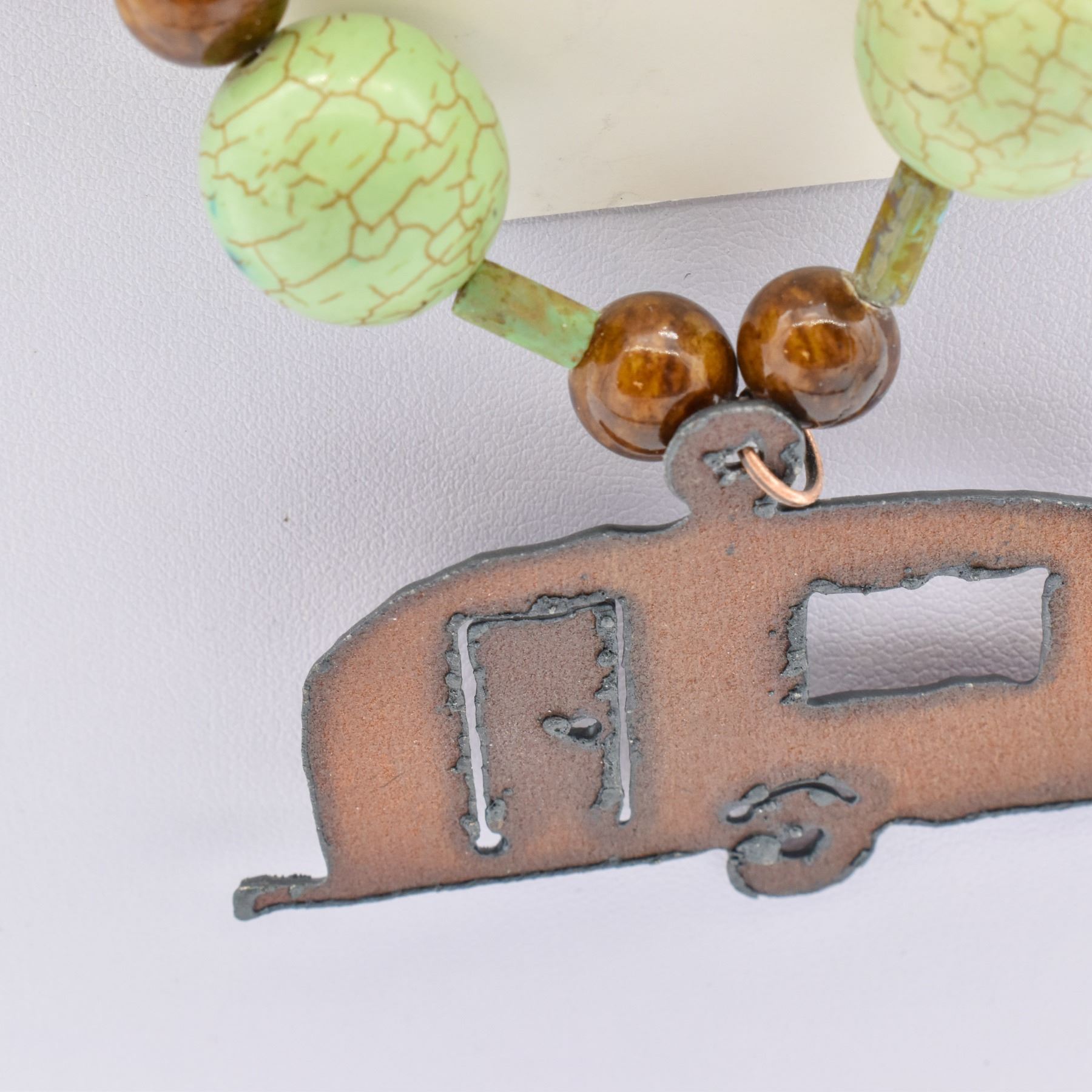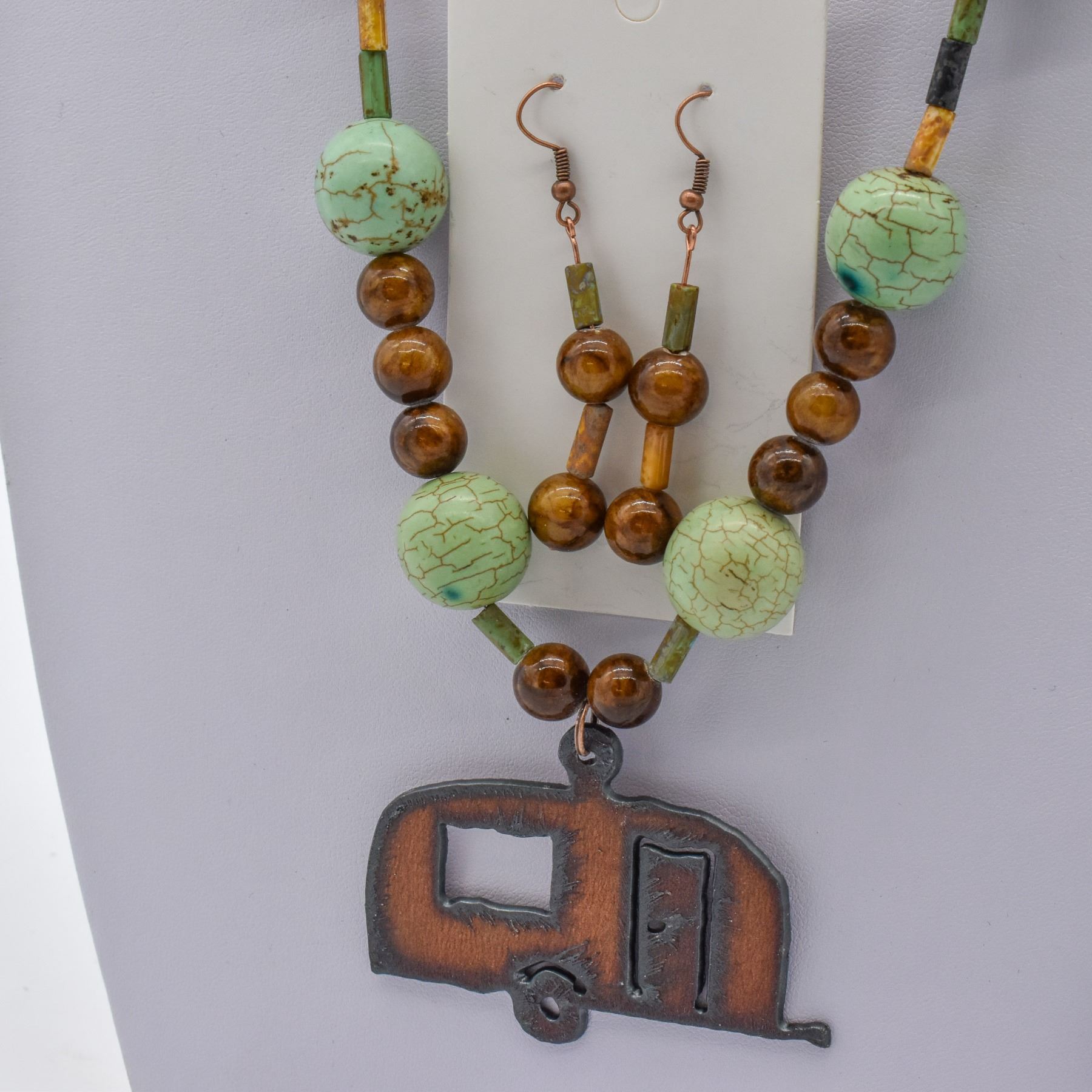 Quail Ridge Studios Travel Trailer Pendant Necklace and Earrings by Larry McLellan, (...''trailer for sale or rent...rooms to let 50 cents''...), necklace is comprised of large 12mm pale green magnesite beads with brown matrix, secondary beads are chocolate brown jasper 10mm beads with Picasso Czech matte tube beads as accent colors, the plasma-cut focal travel trailer pendant measures 2.25'' x 1.75'', matching earrings have a drop of 2'' on copper French wires, The magic of the Desert Southwest is timeless in its display of open landscapes, sunrise and sunset colors with infinite possibilities of artistic expression. The design studio of Quail Ridge was founded on these possibilities, forging an endless variety of earthen gems to their metallic counterparts. The artist, Larry McLellan, designs jewelry contemporary in style, while maintaining elements of native designs.