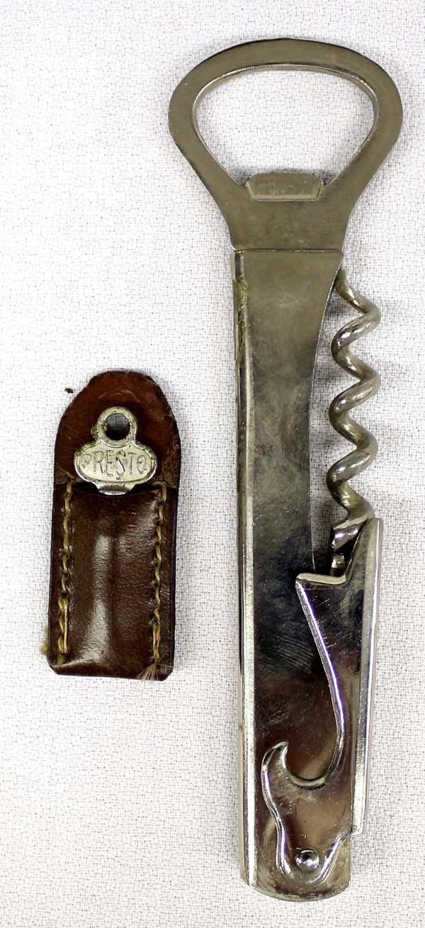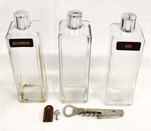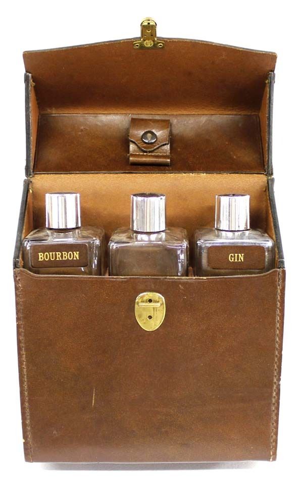 Vintage Traveling Bar in Leather Case, measures 8'' x 9'' and has 3 glass decanters labeled Bourbon, Scotch, and Gin, also comes with bottle opener/corkscrew combo tool