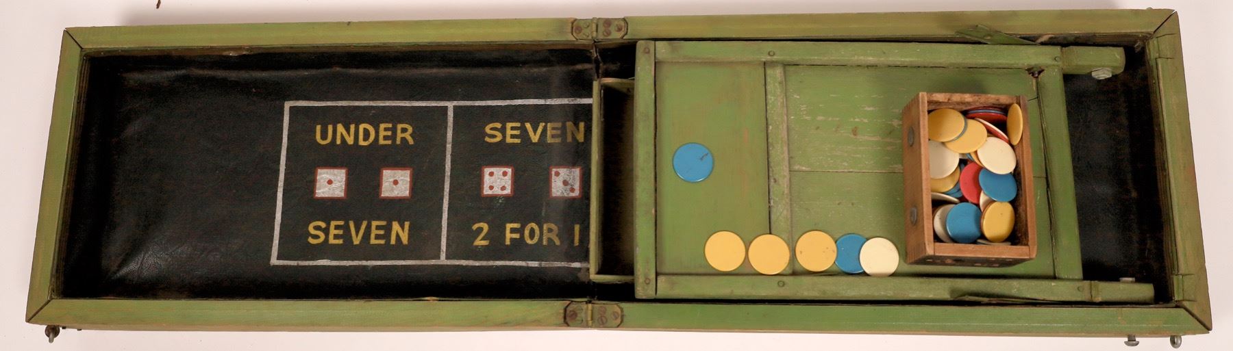 Travelling craps table. Wood, faded green paint. Opens up. Length: 37 1/2" unfolded. Width: 10 3/8". Depth: 5 7/8" folded. Comes w/one die and approx. 90 chips. No manufacturer markings or date but believed to be c. 1930s. Unique!! City: State: Date:
