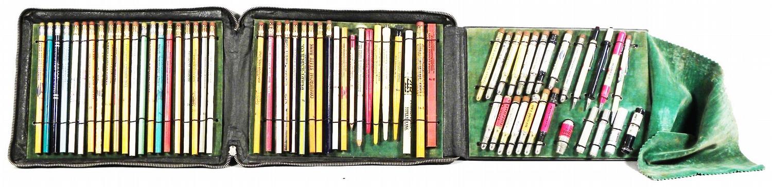 Traveling Salesman's Pencil Display. 66 pieces total in leather case. Excellent condition.