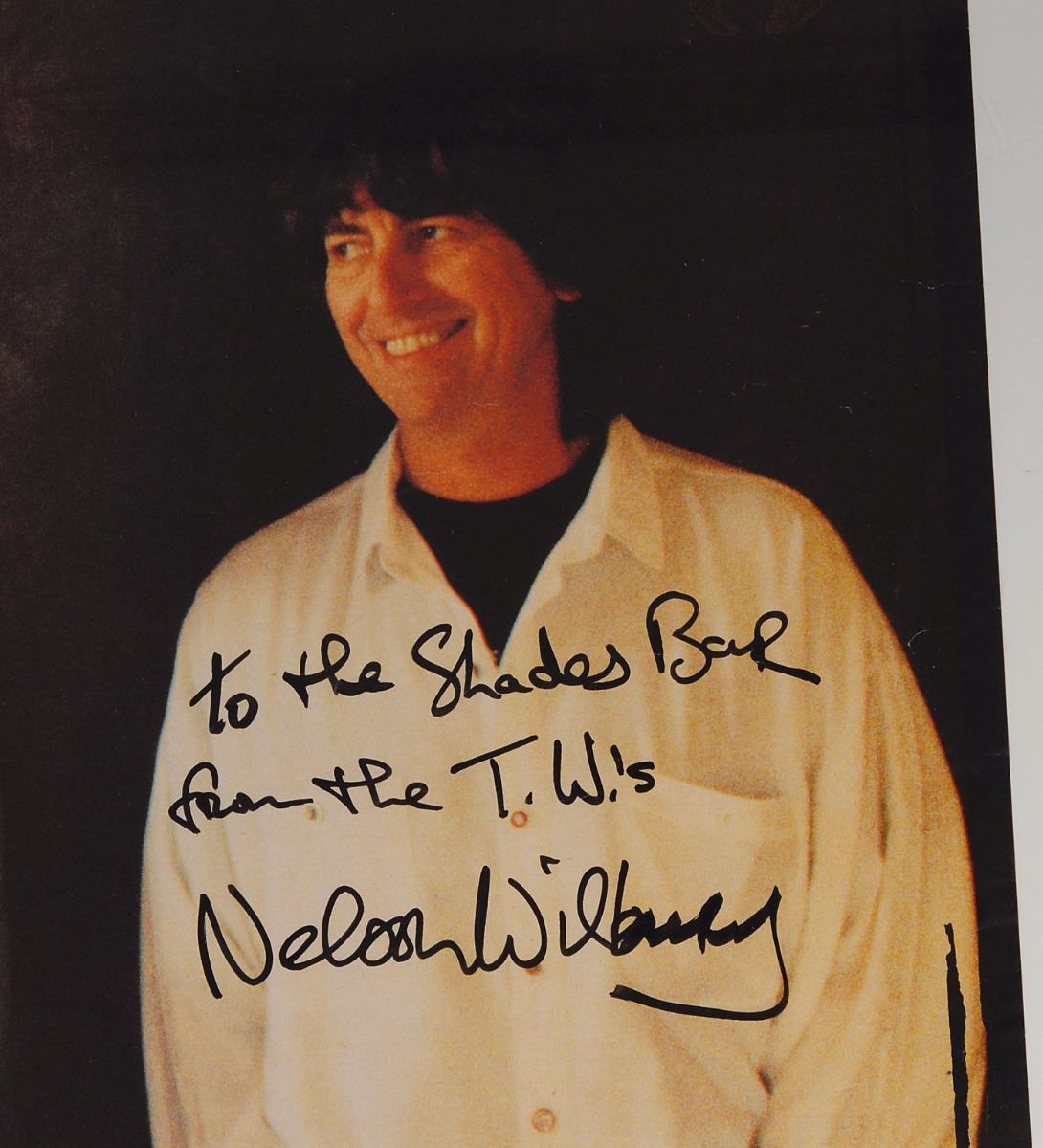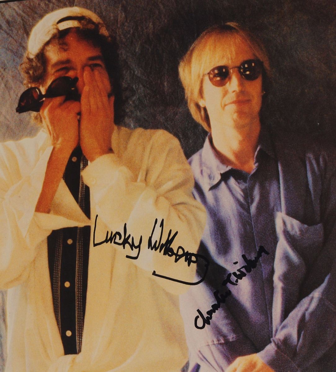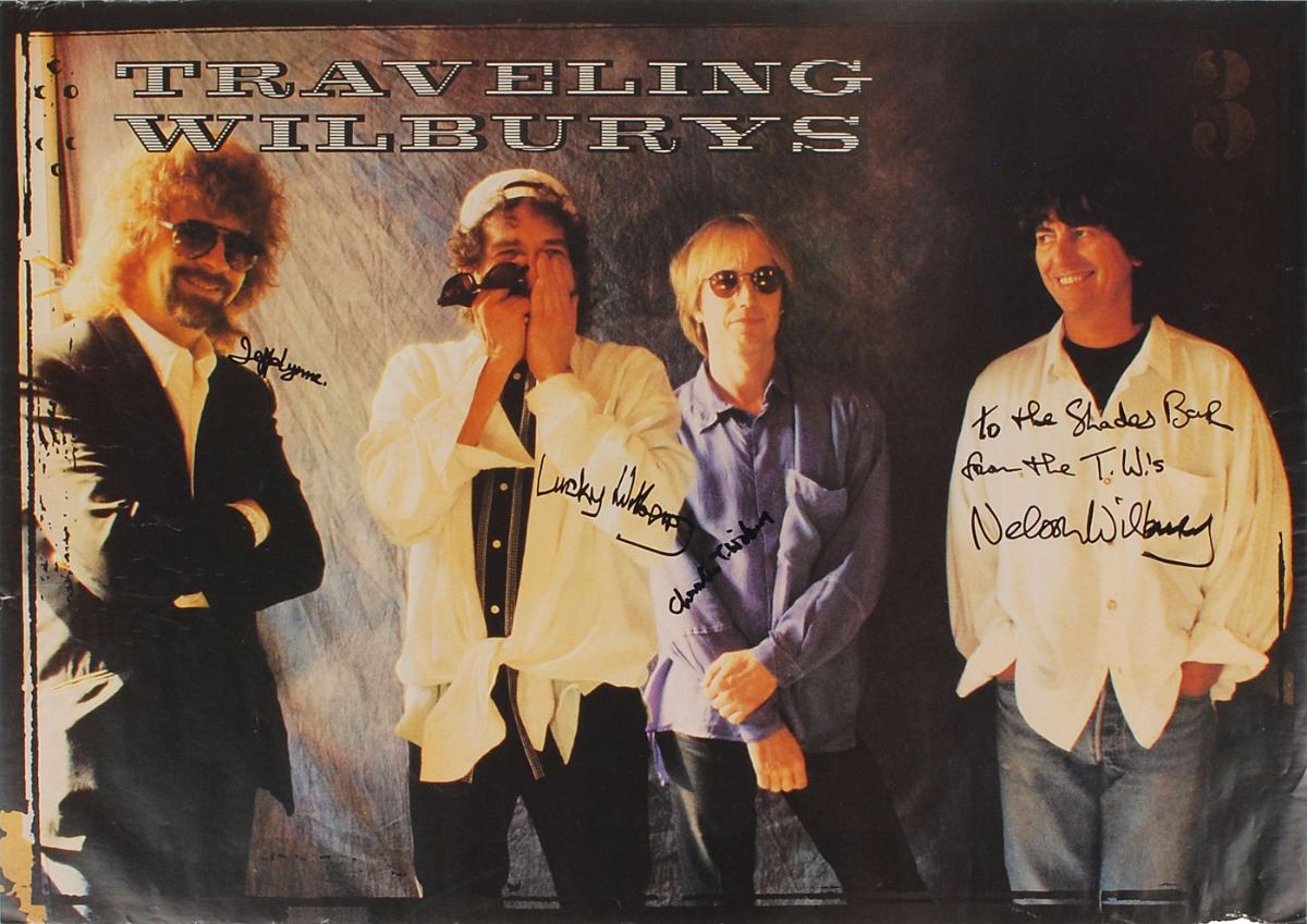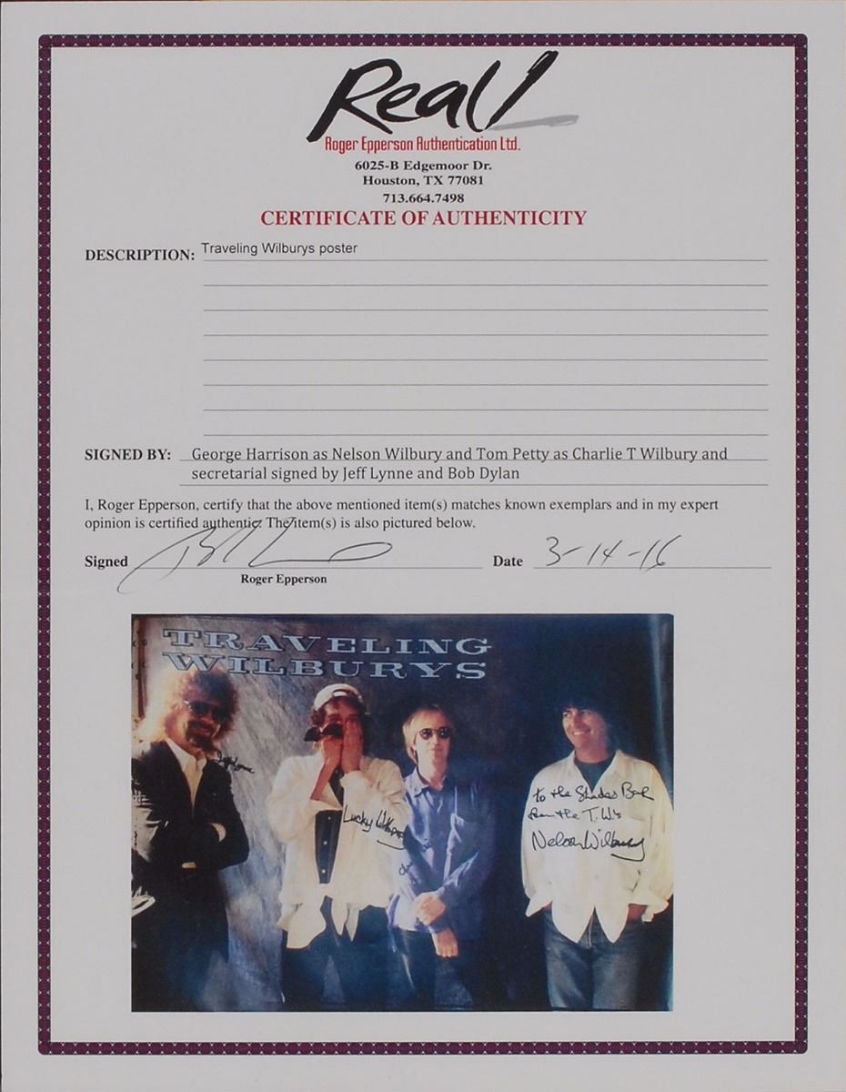Color 33 x 23.5 poster of the Traveling Wilburys supergroup, signed and inscribed in black felt tip by George Harrison, “To the Shades Bar, from the T.W.’s, Nelson Wilbury,” and by Tom Petty, “Charlie T. Wilbury.” Also secretarially signed for Jeff Lynne and Bob Dylan. Rolled and in very good to fine condition, with scattered overall creasing and several edge dings and tears. Accompanied by a full letter of authenticity from REAL. This is the first example we have offered featuring both Petty and Harrison signing with their Wilbury alter-egos.