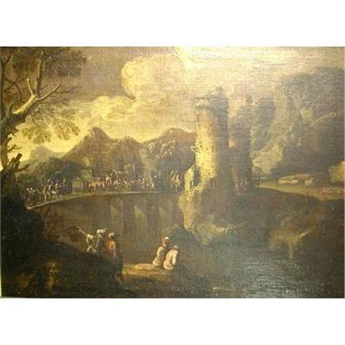 Travellers in an Arcadian Landscape, Follower of Salvator Rosa 1615-1673 </em></td>