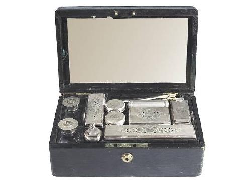 Wooden case with leather cover and with mirror inside, 19 pieces of gent’s toilet-set. Tintless, cut glasses, chiselled, pierced silver covers engraved by machine. Manicure – and razor set with bone handle. The manicure set is incomplete. Distributor’s mark on the fastening: J. Bramah, 124. Piccadilly. Marked: London, 1849. Size: 28.5 x 18 x 11.5 cm