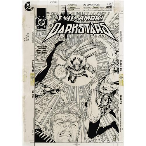 <B>Travis Charest and Scott Hanna - Darkstars #4 Cover Original Art (DC, 1993).</B></I> Evil Star packs a cosmic wallop in this star-powered cover illustration penciled by Travis Charest, and inked by Scott Hanna. The art includes the original logo and masthead paste-up type, and has an image area measuring 10" x 15". The logo and creator type is on two separate acetate overlays which have yellowed; otherwise the condition is Excellent.<BR><BR><b>Shipping:</b> Small Flat (<a target="_blank" href="http://www.heritageauctions.com/common/shipping.php">view shipping information</a>)