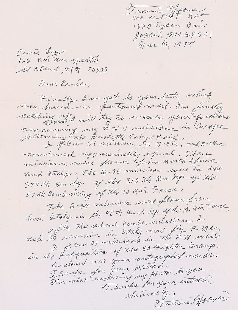 Pilot on plane 2 during the Doolittle Raid (1917–2004). ALS, one page, 8.5 x 11, March 19, 1998. Letter to an admirer. In part: “Now I will try to answer your questions concerning my WWII missions in Europe following the Doolittle Tokyo Raid. I flew 51 missions in B-25s and B-24s combined…These missions were flown from North Africa and Italy…I flew 21 missions in the P-28 while in the Headquarters of the 82nd Fighter Group.” In fine condition.