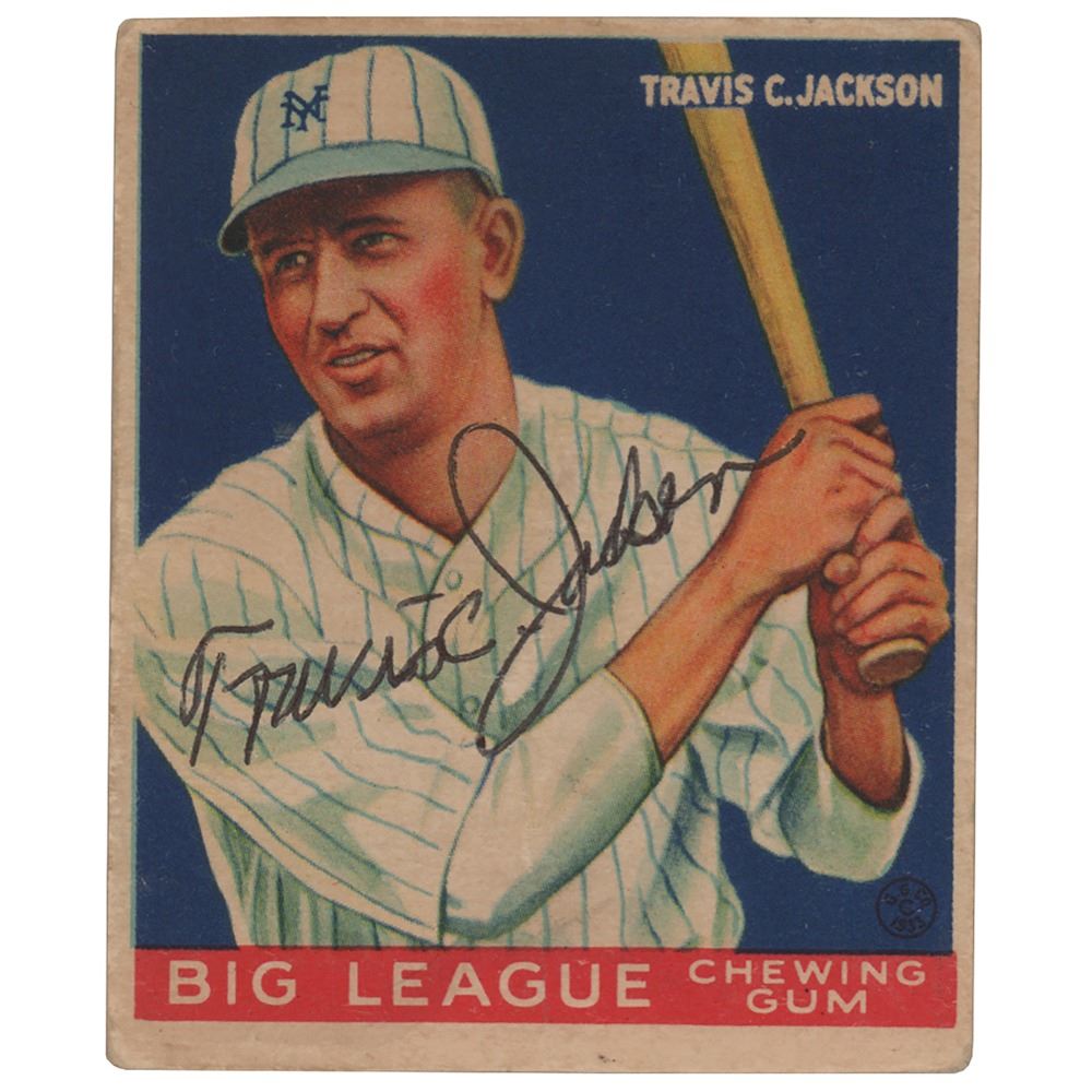 Vivid 1933 Goudey #102 Travis Jackson baseball card, signed in black ballpoint by the Hall of Famer, "Travis C. Jackson." In very good to fine condition, with a light central vertical crease to the bottom, and light mounting adhesive remnants to reverse.