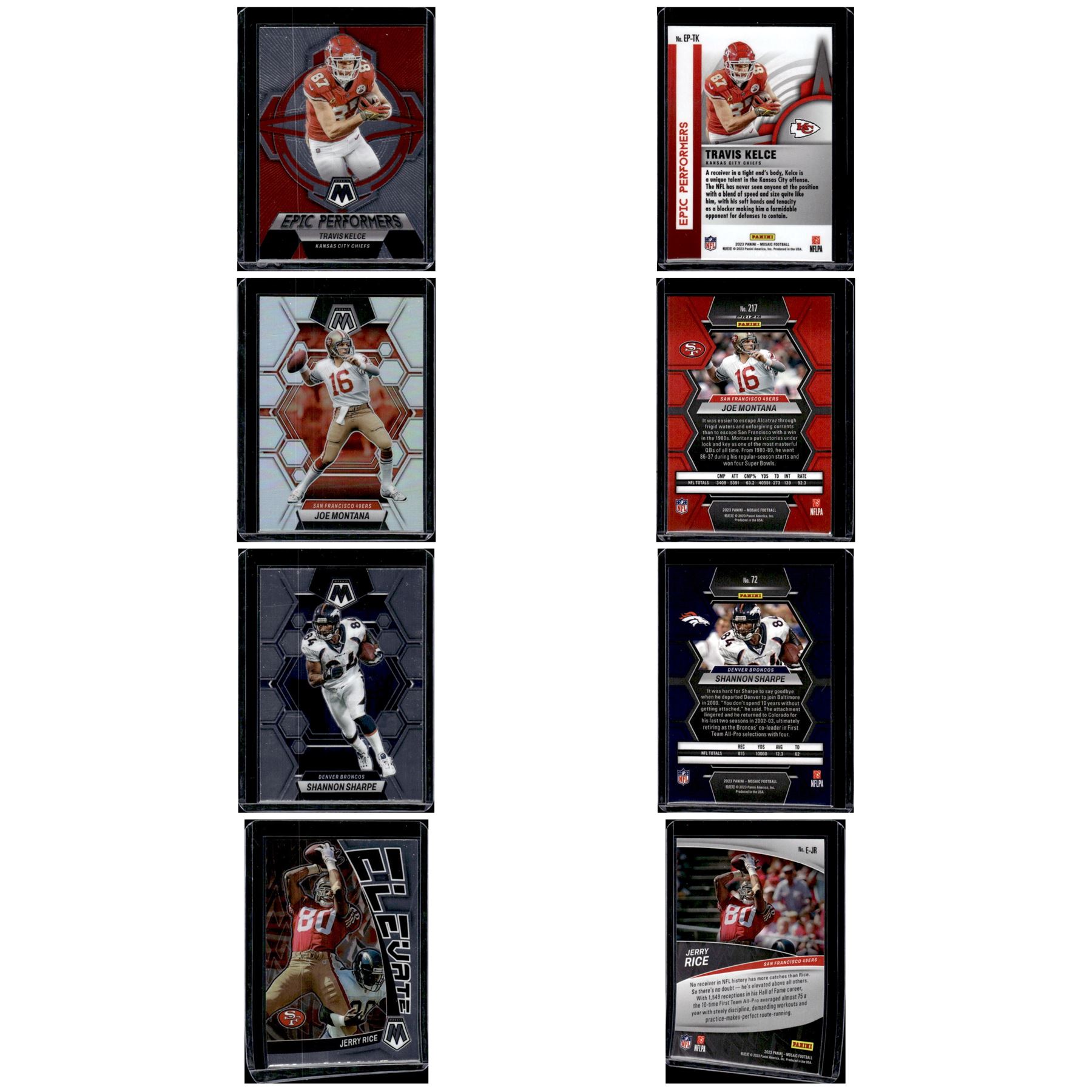 Travis Kelce Epic Performers Insert, Joe Montana Mosaic Silver Prizm, Shannon Sharpe Mosaic, & Jerry Rice Elevate Insert.
