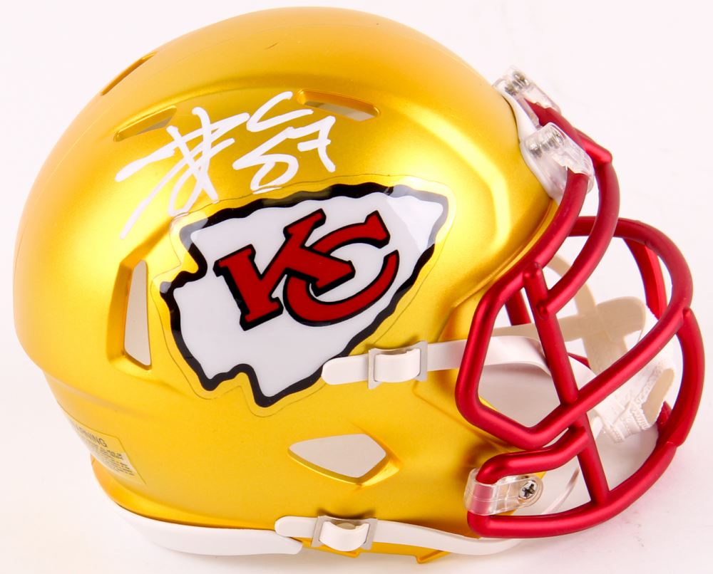 Kansas City Chiefs blaze mini helmet has been hand signed in white paint pen by Travis Kelce. Please note, there are stray pen markings on the helmet.