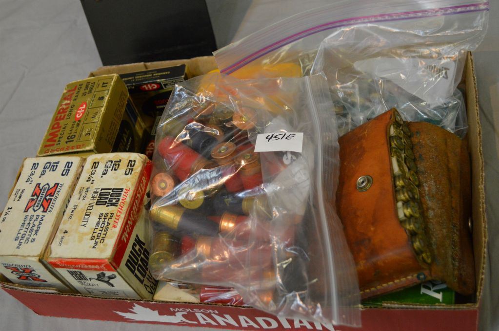 Tray Lot : .12 Ga Shot Shells & Slugs [ some in boxes, some in bags ] - some .22 & .22 Mag ammo in tobacco tins - bag : loose .410 Ga Shot Shells - leather ammo pouch w/ 20 rnds .300 Wthby Mag - 17 rnds Remington .300 Wthby Mag ammo