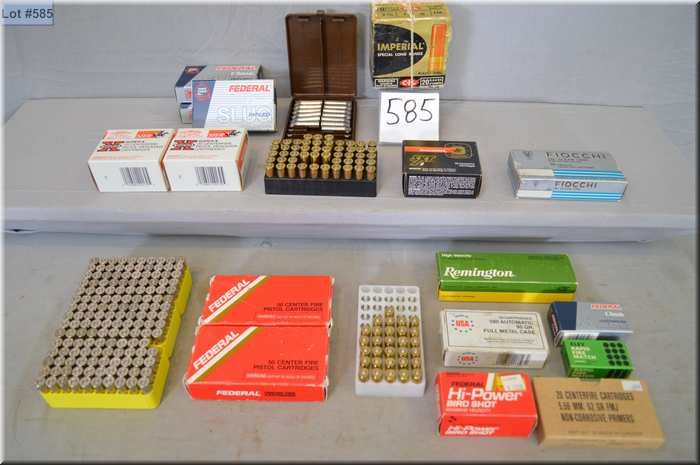 Tray Lot : 2 ( 20 rnds per ) .45 Colt ammo - 1 ( 20 rnds) .9 MM Luger ammo -3 boxes Federal .32 S & W Long - 3/4 Box .380 Auto - 1 box .20 Ga - 3 Boxes ( 5nds ) .12 Ga Rifled slugs - 1 ( 20 rnd ) .44 Rem Mag - .22 Bird Shot - asstd .22 ammo