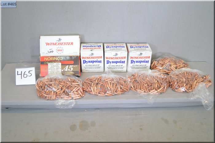 Tray Lot : 3 Boxes ( 500 rnd ) Win Dynapoint .22 LR Ammo - approx. 75 rnds .45 Auto reloads - plastic bags of unknown cal ? lead copper jacketed bullets