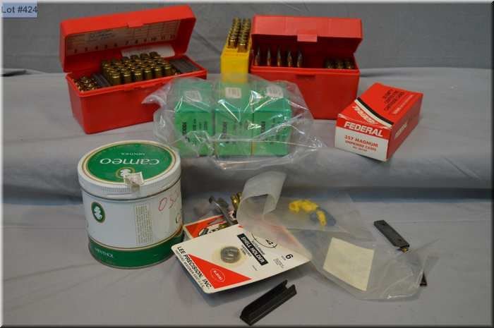 Tray Lot : 3 boxes .30 cal bullets - box .357 unprimed brass - stripper clips - can of bullets ? - 15 rnds .308 reloads - 25 rnds .270 reloads plus brass - 30 rnds plus brass Military Hard point reloads -