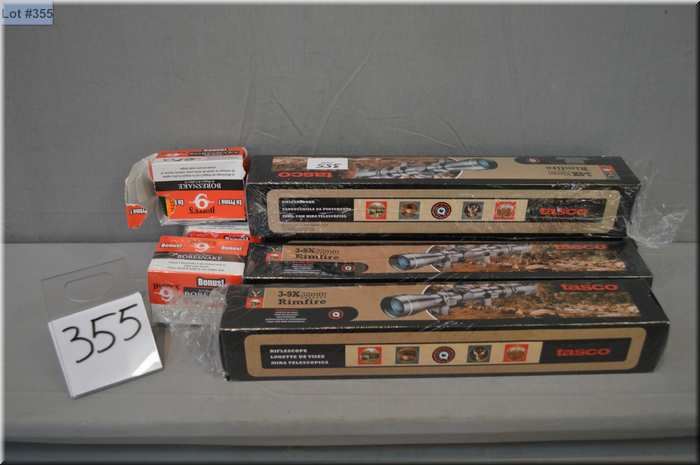 Tray Lot : 4 Tasco 3 x 9 x 32 Rimfire Scopes w/orig boxes appear as new, some damage to boxes - 3 Hoppes .22 Cal Bore Snakes w/orig boxes appear as new ( one box damaged )