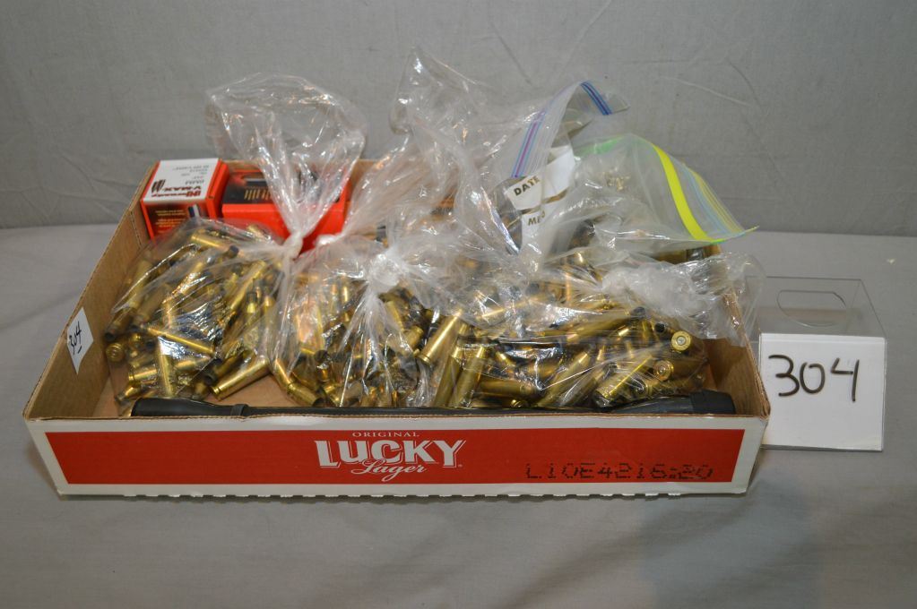 Tray Lot : .6 MM bullets - .45 Auto cal brass - .30-06 brass - various other caliber brass - Weaver K6 60B Scope missing one side cap