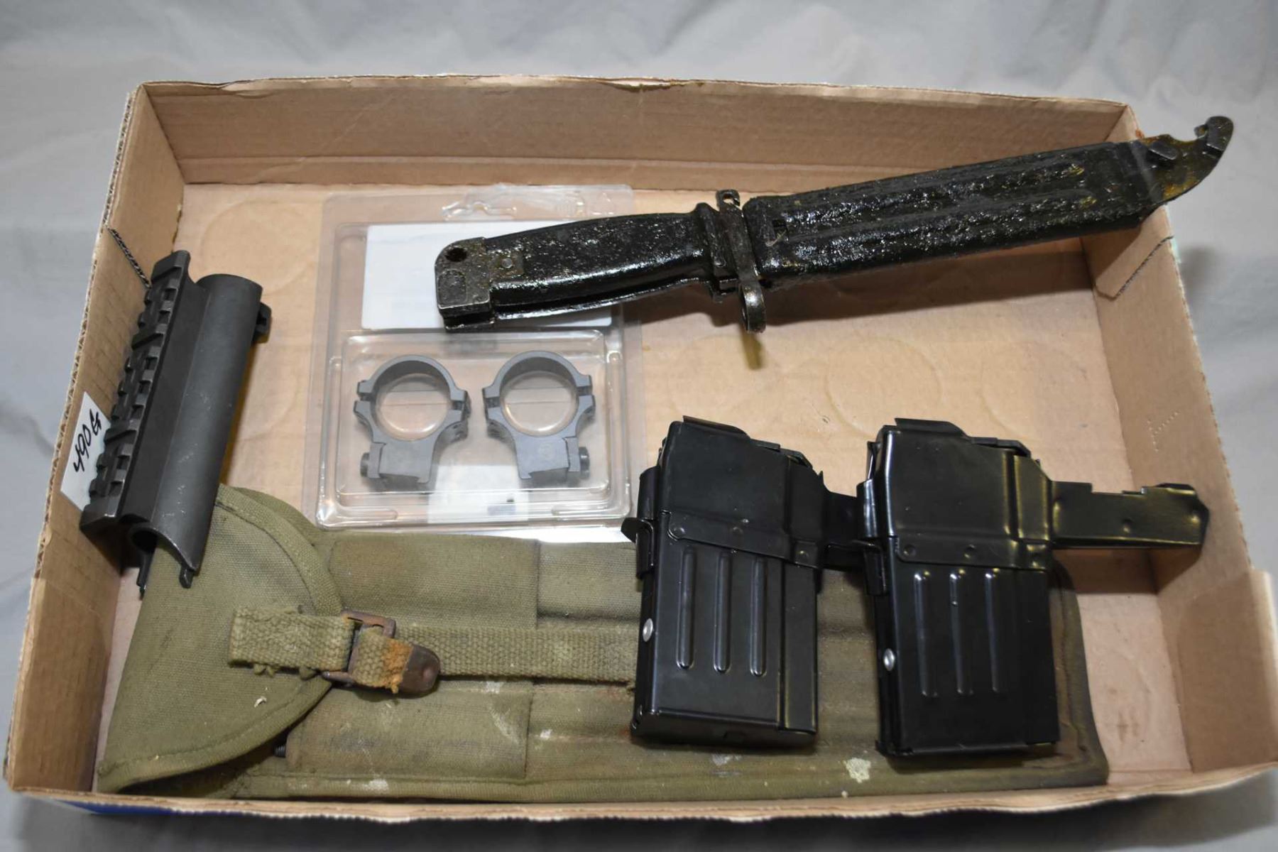 Tray Lot : AK 47 Bayonet & Scabbard [ still in grease ] - One SKS Dust Cover - Two SKS Mags [ 5 rnd ] - Military Cleaning Kit [ in case ] - One Set of Montaz Ceska CZ 527 30 MM Scope Rings [ in orig pkg ]