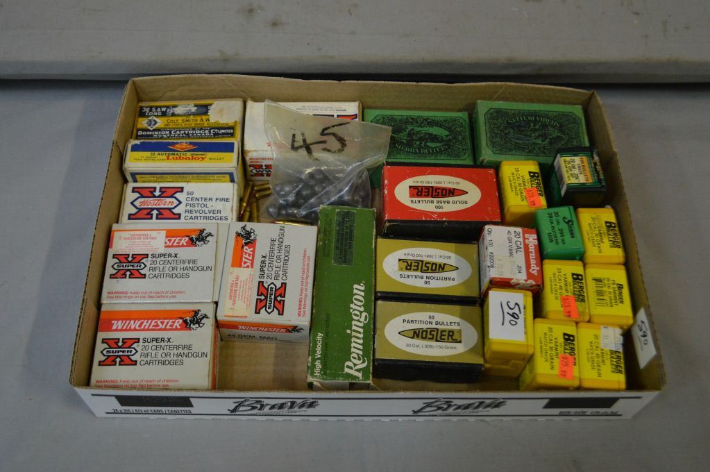 Tray Lot : Ammo & Bullets : .20 Cal , .30 Cal , Ammo : Misc Pistol Ammo - 67 Rnds .44 Mag Cal Ammo - .38 Spec - Approx. 2 Boxes .32 Auto Cal Ammo - 13 Rnds .44 Rem Mag Ammo - Bag : .45 Cal Balls - Approx. 17 Rnds .HMR ? , etc.