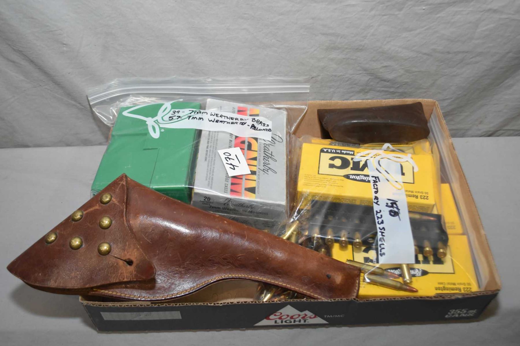 Tray Lot : Approx. 150 Rnds .223 Cal Fact Ammo - Bag : 57 Rnds .7 MM Wby Mag Reloads - 39 Rnds .7 MM Wby Mag Brass - Old Leather Flap Holster w/ brass tacks, etc.