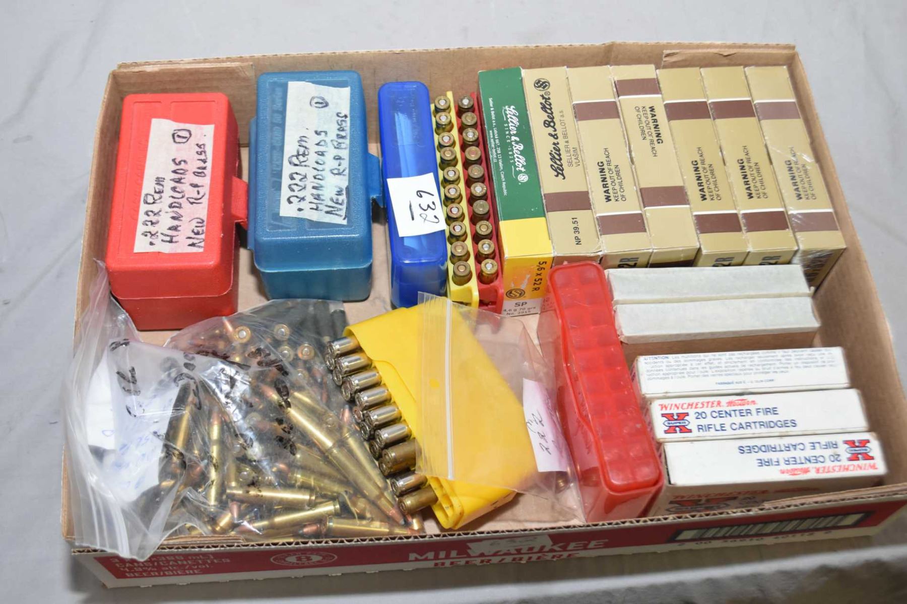 Tray Lot : Approx. 190 Rnds Plus .222 Rem Ammo - 5 Boxes .222 Rem Brass - Seven Boxes 6.5 x 52 R Cal ( 20 rnds Per ) Ammo Appears Factory