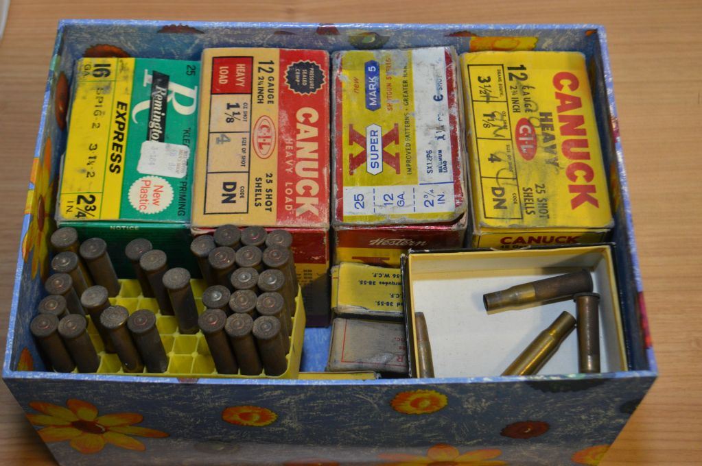 Tray Lot : Approx. 3 Boxes .12 Ga Shot Shells - Part Box .16 Ga Shot Shells - approx. 25 rnds .25 - 20 Rem UMC in old two pce box - approx. 10 rnds plus brass .38 - 55 ammo - Box : 20 rnds Dominion .44 - 40 Cal ammo - asstd old brass , etc.