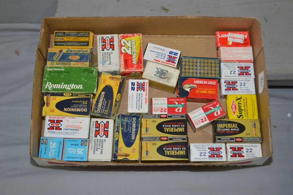 Tray Lot : Approx 750 Rnds .25 Auto Ammo [ some collectible ] - approx 180 rnds .22 Mag ammo - approx. 700 rnds .22 LR cal ammo