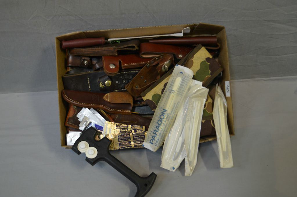 Tray Lot : Approx. Seventeen Empty Leather Knife Sheaths - Camo Survival Kit [ bandaids, etc ] - Camo Buck Spin small saw - Fire Stone Sharpener - Five Paragon English Scalpel Blades [ in pkgs ] - Approx. 20 Various Replacement Blades, etc.