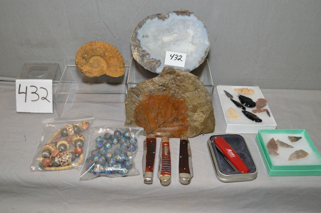 Tray Lot : Arrow Heads found at Mouth of Columbia River, Oregon in box - Arrowhead found in South Texas in box - Fossils Ammoinite ( uncut leaf fossi ) - Cased Victorinox Swiss Army Knife - Three Case Folding Pocket Knives - Geode Rock ( cross sectioned & polished ) - Arrow Head found at Ft. Benton, Montana etc.