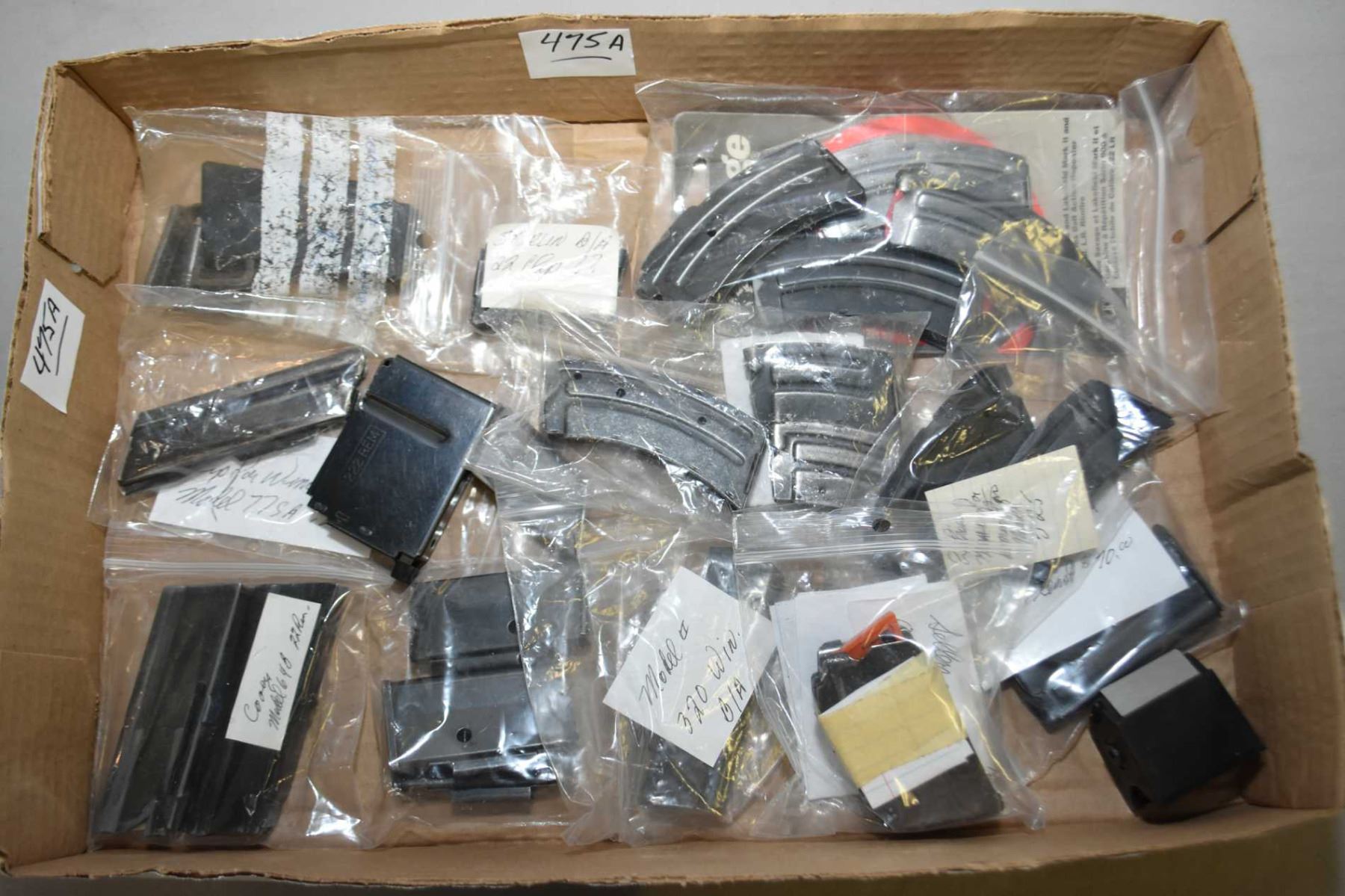 Tray Lot : Assortment of Mags Mostly .22 Cal : Cooey Mod 64 .22 - Bag w/ 4 Savage .22 - Ruger 10 - 22 - ( 2) Cooey Model 64B - Win Mod 77 - Bag w/ 3 .22 Mags - Unknown .22 - Sterling .22 ? - Savage Mod 223A - Win 320 - Bag w/ 3 .22 Mag - Bag : 2 Rem 525 Mags - Bag : ( 2 ) Marlin Mags fits note inside - Rem .222