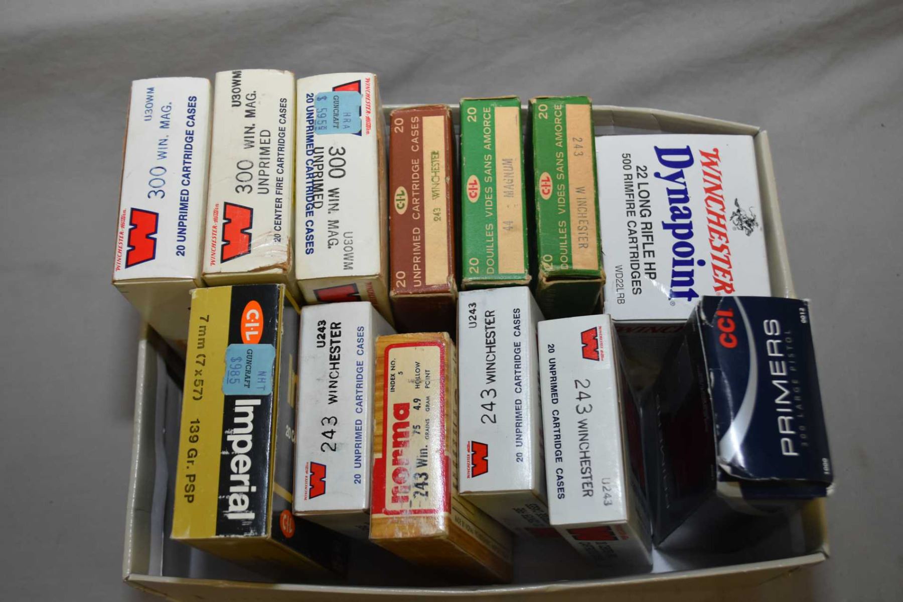 Tray Lot : Box ( 500 Rds ) Winchester Dynapoint .22 LR HP Ammo - Asstd CCI Primers - Various Boxes of Brass : .243, .300 Win Mag, some primed - One Box .7 MM Mauser Ammo