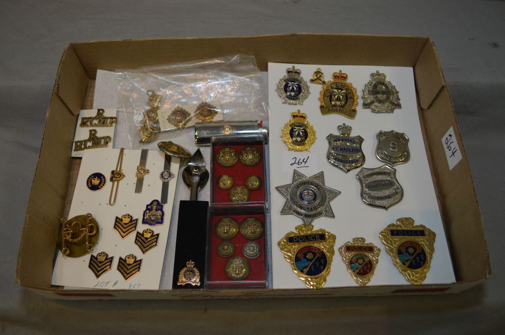 Tray Lot : Card with Police Badges [ Coaldale, Ft. McLeod, Blood Tribe, etc, ] - two small plastic cases w/ brass Military buttons, RCMP Items includ : bottle opener, lighter, tie pins, etc.