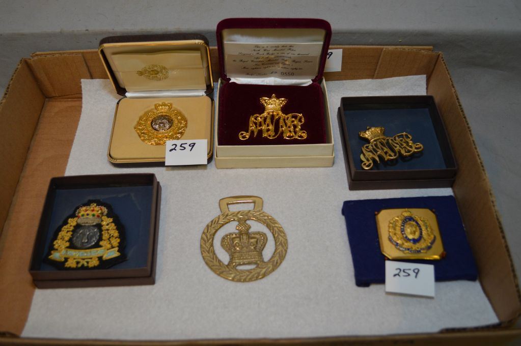 Tray Lot : Cased RCMP Ltd Edition Reproduction Officer's Forage Cap Badge North West Mounted Police 24 Kt Gold Pltd 1000 Only Prod - RCMP Ltd Edtion Reprod North West Mounted Police Sergeant's Pouch-Badge MP # 550 - RCMP Reprod N.W.M.P Officer's Helmet & Despatch Pouch Badge Gold & Silver Pltd [ was first style worn in 1876 by Officer's of the N.W.M.P. - Reprod R.N.W.P. Badge gilt w/blue enamel design - Reprod N.W.M. P. Badge - Brass Horse Brass [ Crown in Wreath ]