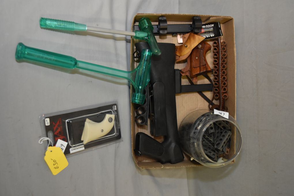 Tray Lot : Composite Butt Stock w/swivels - Two Kenetic RCBS Bullet Pullers - Leather Ctg Holder - Speed Stripper - Shot Shell Holder - Accu Wedge in pkg - Glass Jar : .303 Brit Ammo in zip clips - Smith & Wesson Rosewood Grips - Set of Wooden Grips - New in Pkg Ruger Vicaro Ivory Like Grips - BC Square Base w/rings