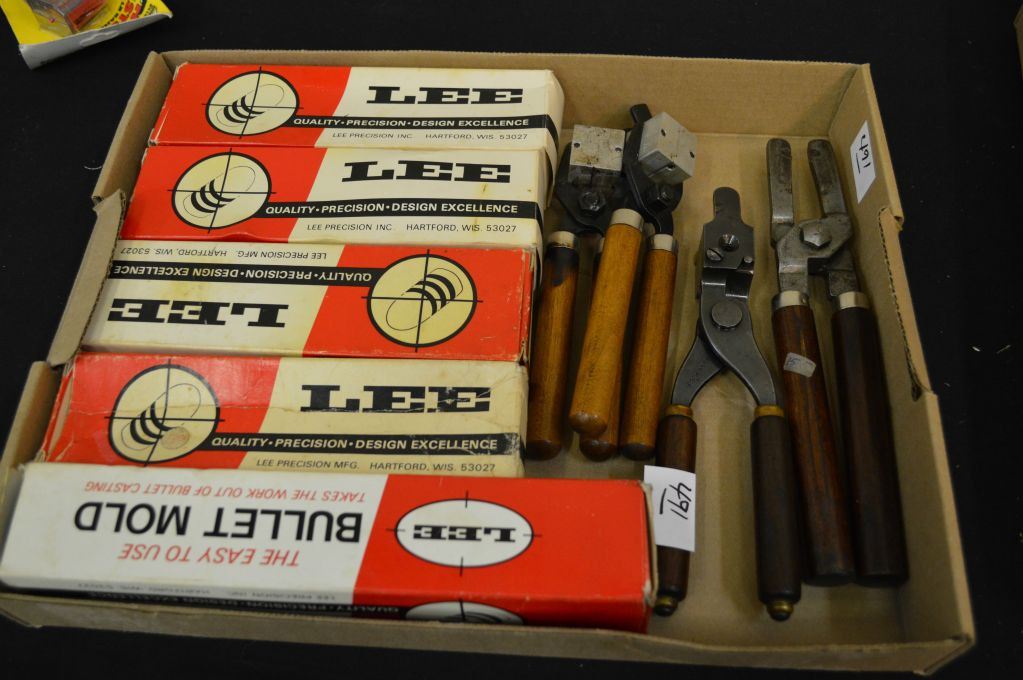 Tray Lot : Five Lee Bullet Molds [ in boxes ] - Two Lee Bullet Molds - Set of RCBS Handles - Winchester .25 - 20 WCF Bullet Mold