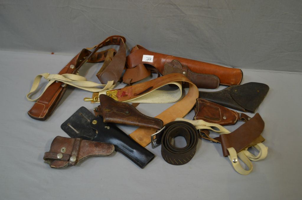 Tray Lot : Five Small Leather Holsters - One Small & Two Lg Shoulder Holsters - leather ammo pouch - leather belt - Llama Brand razor strap