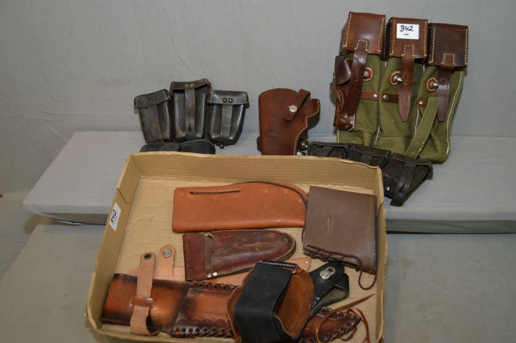 Tray Lot : Four empty knife sheaths - two holsters - Military three pouch [ appears new ] - two leather Military triple pouches -