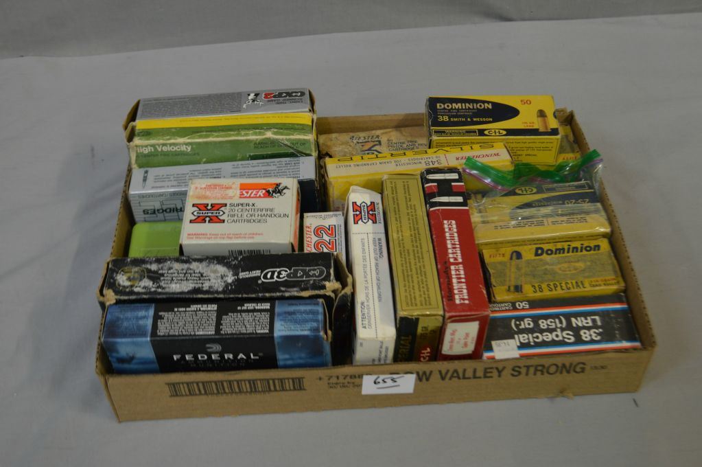 Tray Lot : Full & Part Boxes of Ammo [ maybe some reloads ] : .38 Spec - .38 S & W - .340 Win - .7 MM Rem Mag - .308 - .270 Win - .300 Win - .22 - .338 Win - etc.