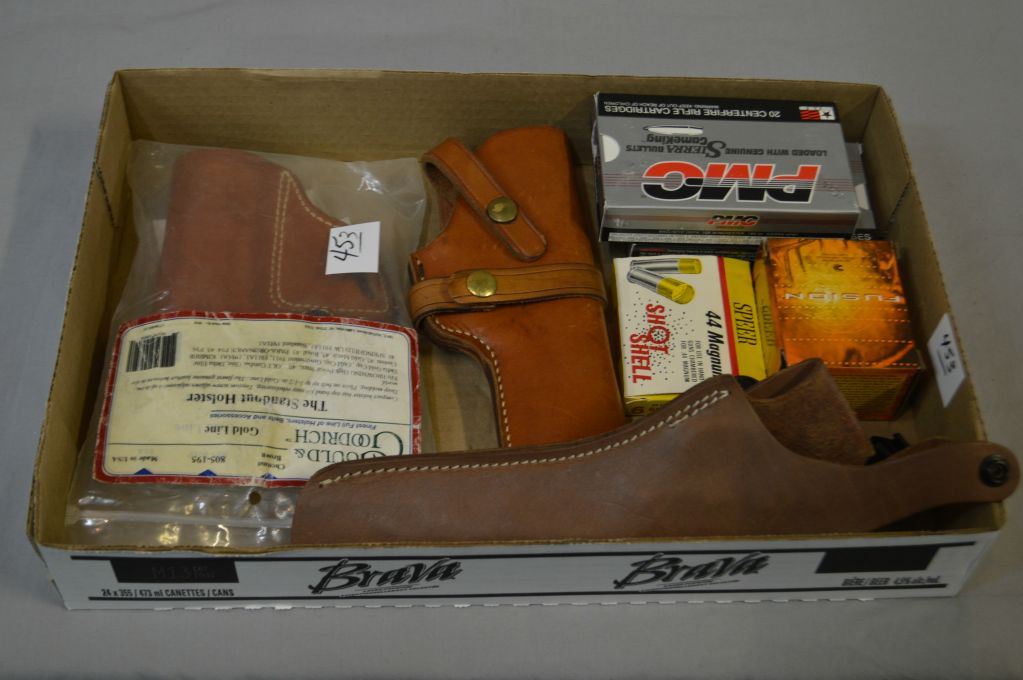 Tray Lot : Gould & Goodrich The Stand Out Holster, fits 1911's or Browning Hi Powers [ new in pkg ] - Brauer Bros. St. Louis leather holster fits 1911 etc. - Guide Gear leather holster for revolver - 38 rnds PMC .308 ammo - 20 rnds Fusion .44 Mag Cal ammo - 6 rnds Speer .44 Mag Shot - 1 combination trigger lock opens at 000, two screw locks ]