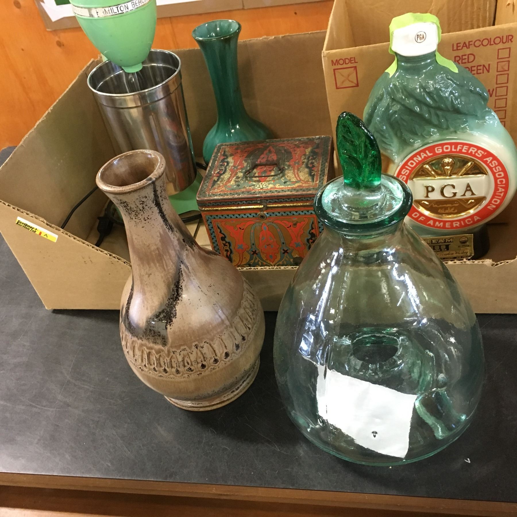 Tray Lot: Hamilton Beach Mixer, BMP, Tin, Bourbon Decanter, Fly Catcher