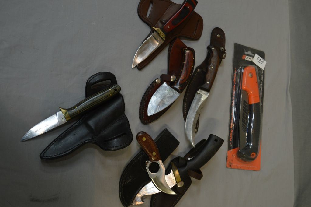Tray Lot : Haughtan Hunting Knife w/scabbard, blade engraved "Clint Sanborn" - Brown Hunting Knife w/scabbard, blade engraved "Clint" - Skinning Knife w/ blade engraved "Clint" w/leather sheath case by J.A. Blades - Lamplough Cutlery Trapper Knife w/leather sheath - Hunting Knife w/gutter w/ sheath blade engraved "Clint" - Premier Skinning Knife w/finger hole w/leather sheath - Echo Folding Pruning Saw [ new in pkg ]