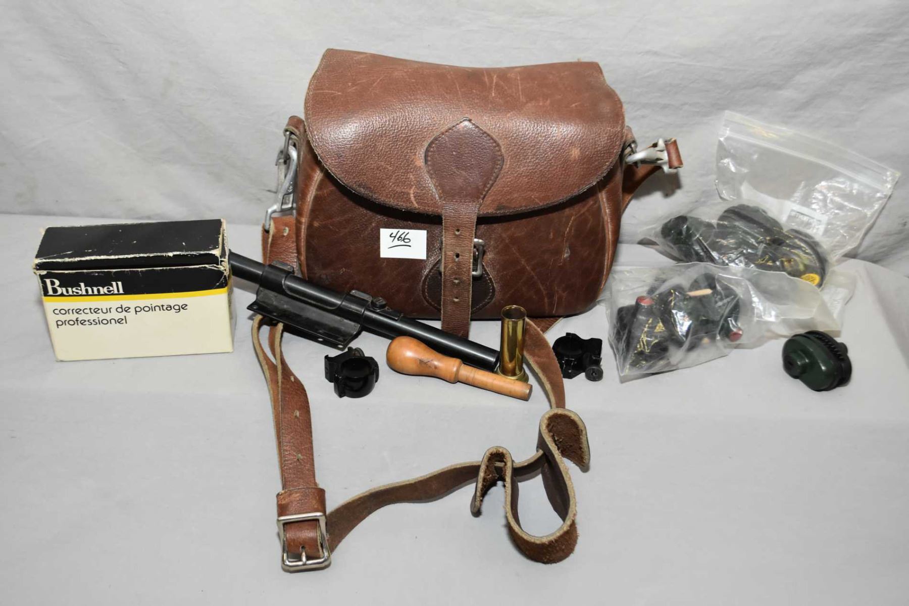 Tray Lot : Heavy Leather Bag : Various trigger and cable locks w/keys - Set of Rings - Weaver B4 Scope w/ side mount base - Bushnell Proff Bore Sighter w/ orig case & box - etc.