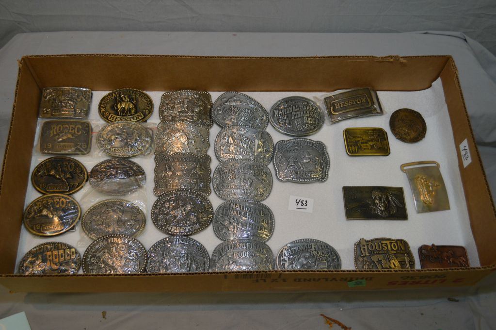 Tray Lot : Hesston National Final Rodeo Belt Buckles [ non complete set ] : 1975 - 1996 , missing 1983 but has 1998, extra 1977, also Seven extra belt buckles : 7 th Cavalry Rough Riders - Hesston Buckle - Royal Canadian Dragoons - Geronimo - Calgary Herald - Houston Livestock Show & Rodeo - Royal Canadian Dragoons