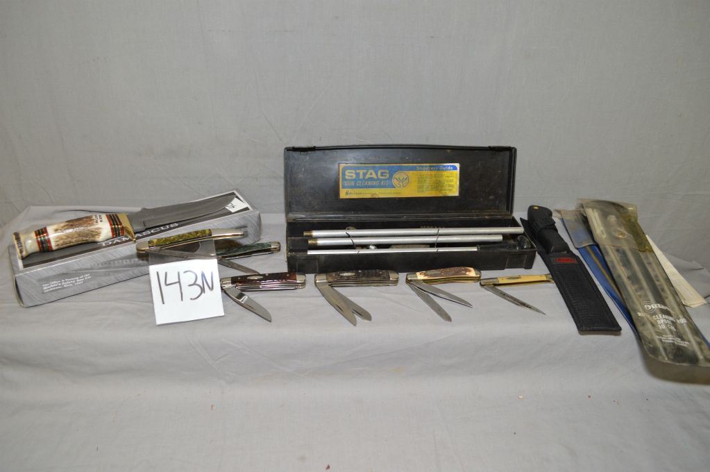 Tray Lot : Marbles Damascus Hunting Knife w/case new in box - Six Pocket Knives [ Case,Uncle Henry, Winchester, etc ] - Berkley Knife w/nylon sheath - Three Gun Cleaning Kits