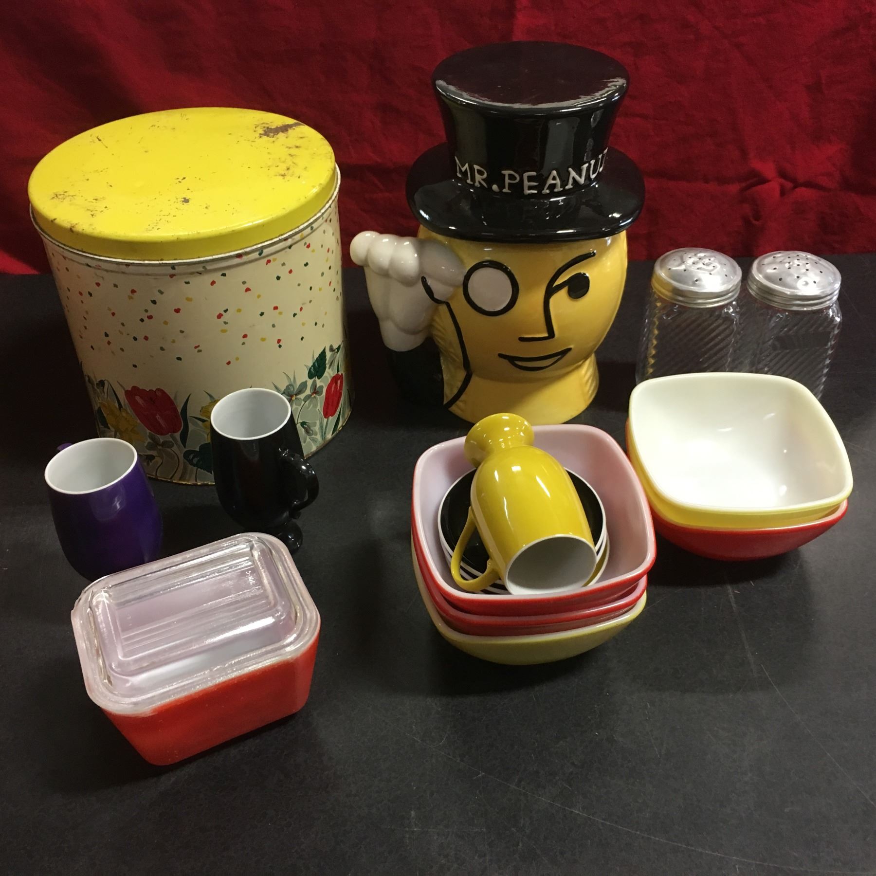 Tray Lot: Mr Peanut Cook, Canister Set, Pyrex Bowls, S&P, etc