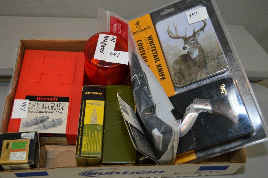 Tray Lot : PAST Handgun Shooting Gloves [ one pr new in orig bag ] - HKS Speed Loader .38/ 357 Mag fits Smith & Wesson Med frame, Ruger GP 100 new in orig pkg - Gerber Folding Hunter Knife [ w/ leather case, new in box ] - Leatherman Super Tool 200 [ new in box - Browning Whitetail Knife Gift Set [ new in pkg ] - Lee Die Set .41 Mag [ new ] - Hornady Die Set .480 Ruger / 475 Linebaugh [ new - 1 Box ( 100 per ) Nosler .8 MM 180 Gr Spitzer Bullets - Uniden Radios [ set of two with batteries and manual included, as new ]