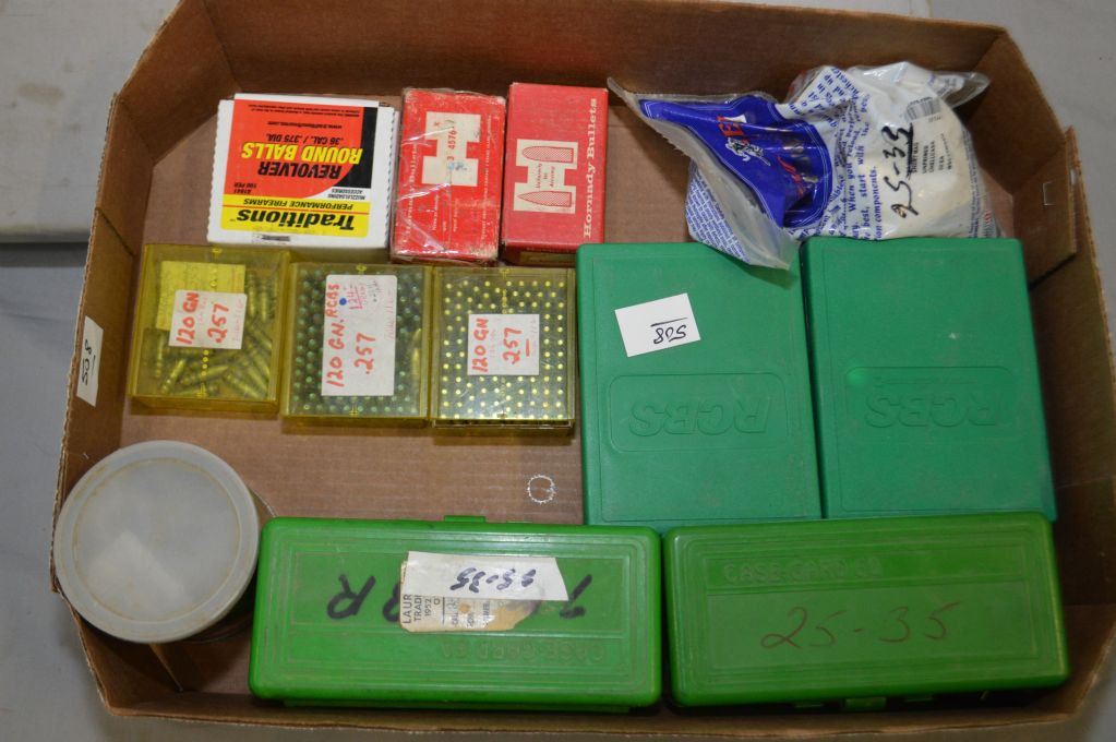 Tray Lot : RCBS .25 - 35 Cal Two Die Set - RCBS .25 - 35 Cal Trim Die - Approx 64 Rnds .25 - 35 Reloads plus brass - Bag : .25 - 35 Cal Brass - Two Boxes .25 Cal Bullets - Box .36 Cal Rnd Balls - 2 & Part Boxes .257 Bullets -